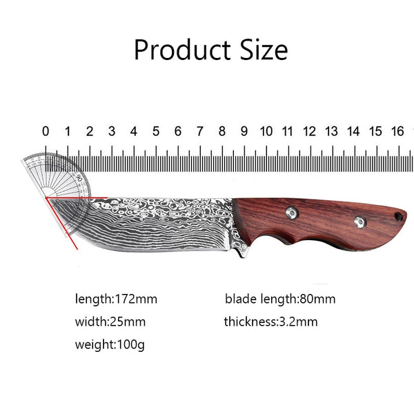 This nice little cutter is patterned after the ancient blades of yesteryear. Damascus steel was highly sought after. The original formula for making Damascus steel has long been lost to time, but this little blade brings back the nostalgia of actually having a knife fashioned in the old ways. This blade will be a handy addition to your gear. It is hand forged high carbon steel and with a digital laser etching giving it the appearance of Damascus steel and just as razor shape nonetheless.
